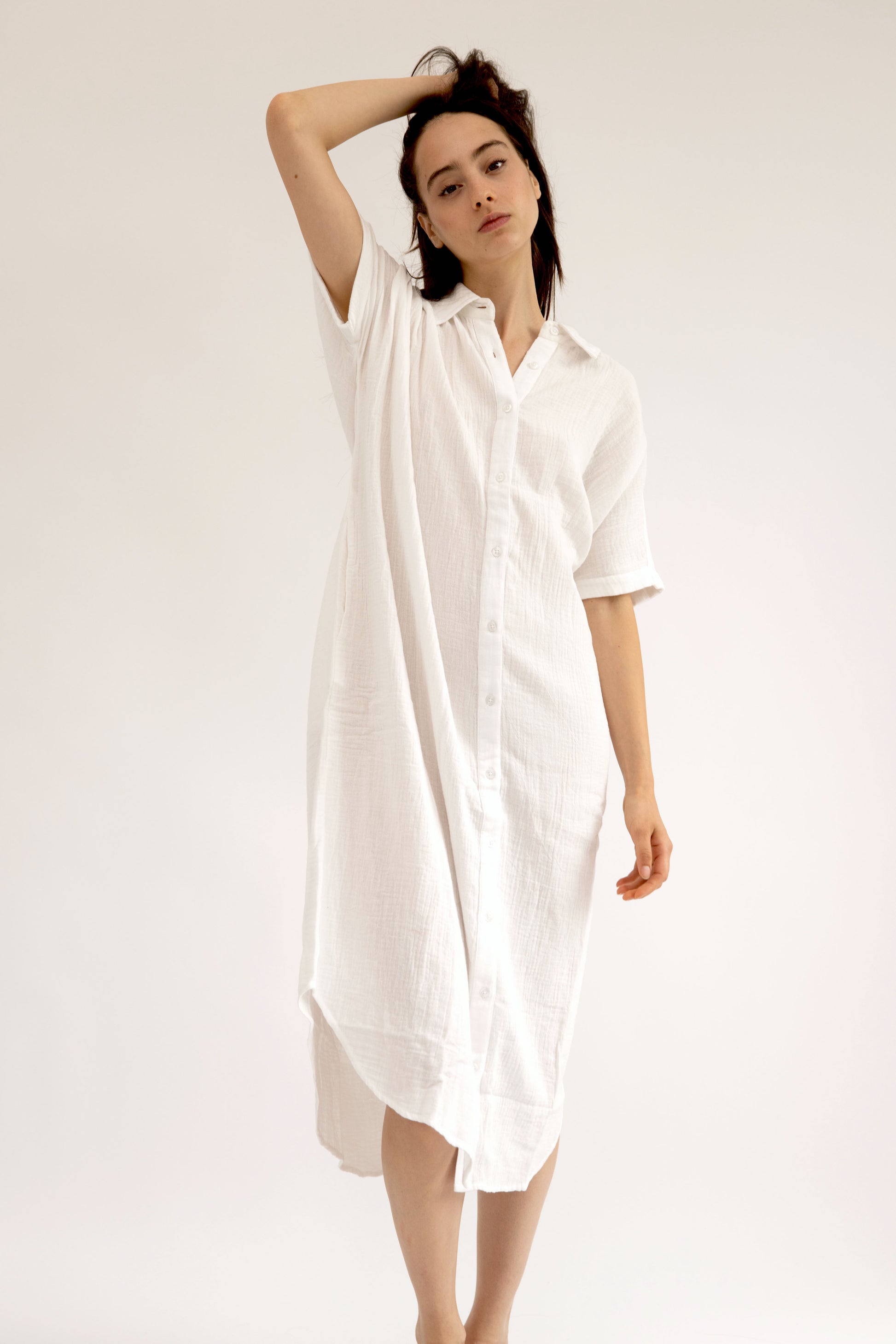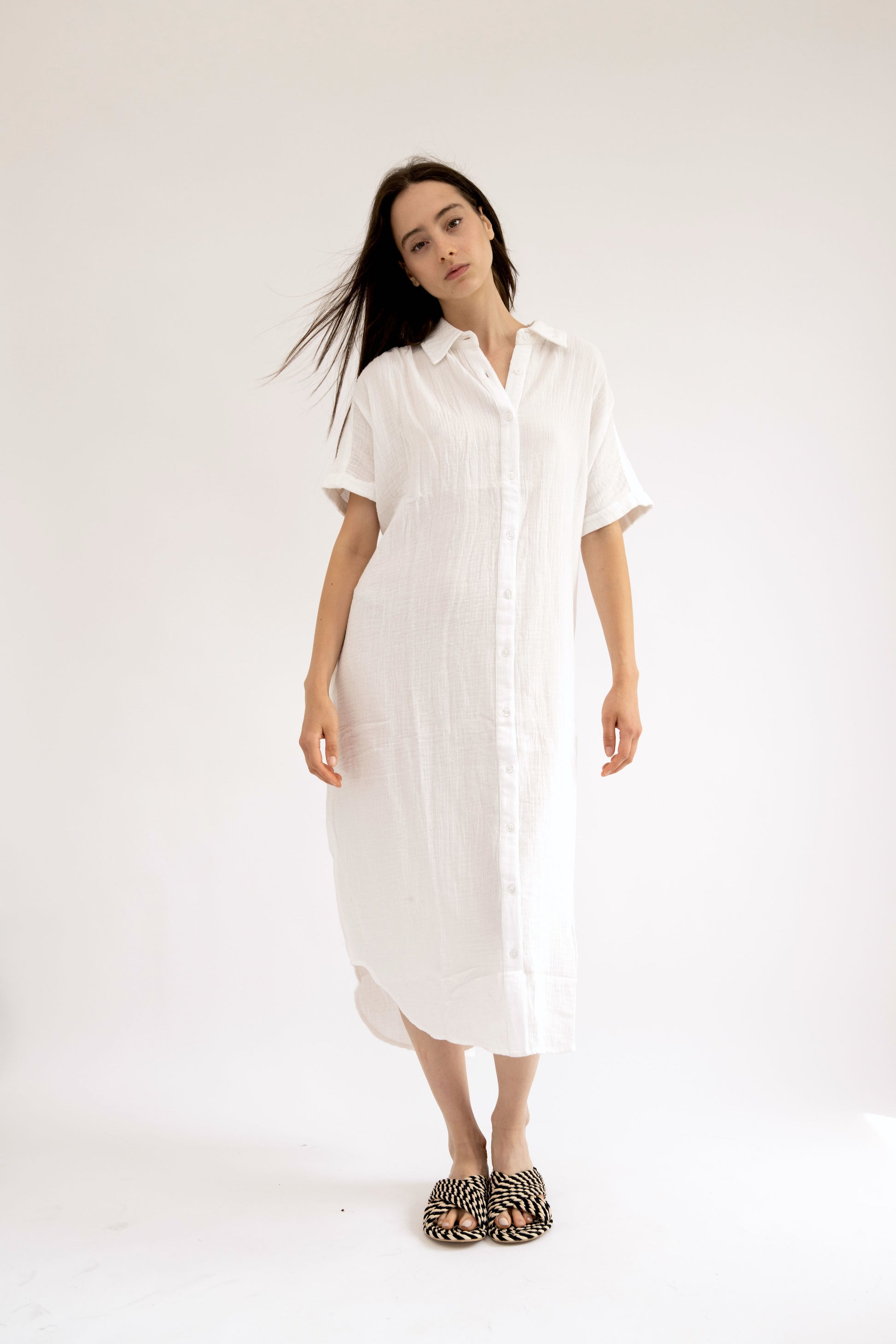 Our one-size-fits-all button-down dress is the epitome of dreamy comfort and effortless style. Made from 100% BCI (Better Cotton Initiative) certified cotton gauze, it’s incredibly soft, breathable, and perfect for warm days. The midi length and oversized fit allow you to wear it in multiple ways—belted, on its own, or open over a tank and denim or paired with our matching shorts.