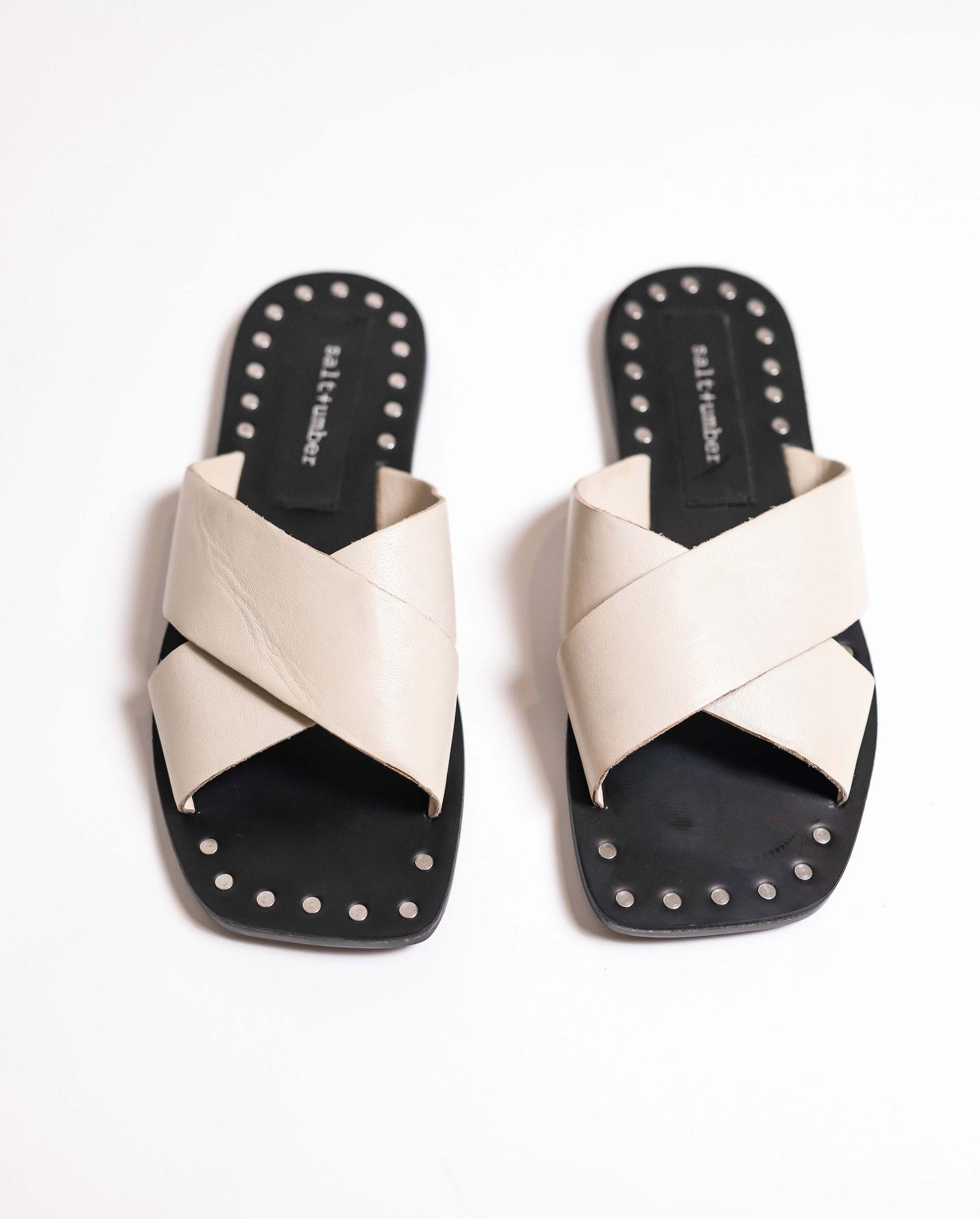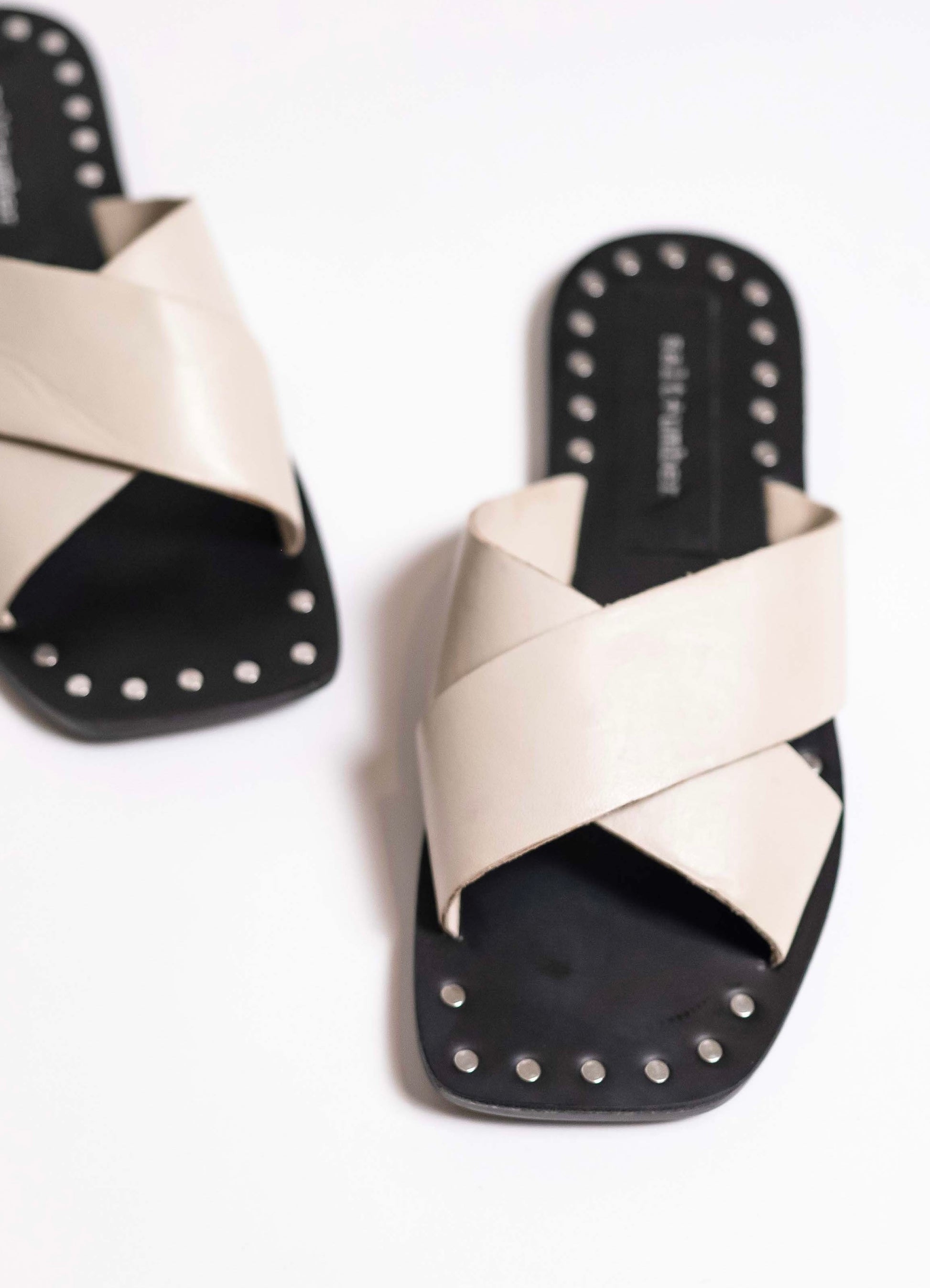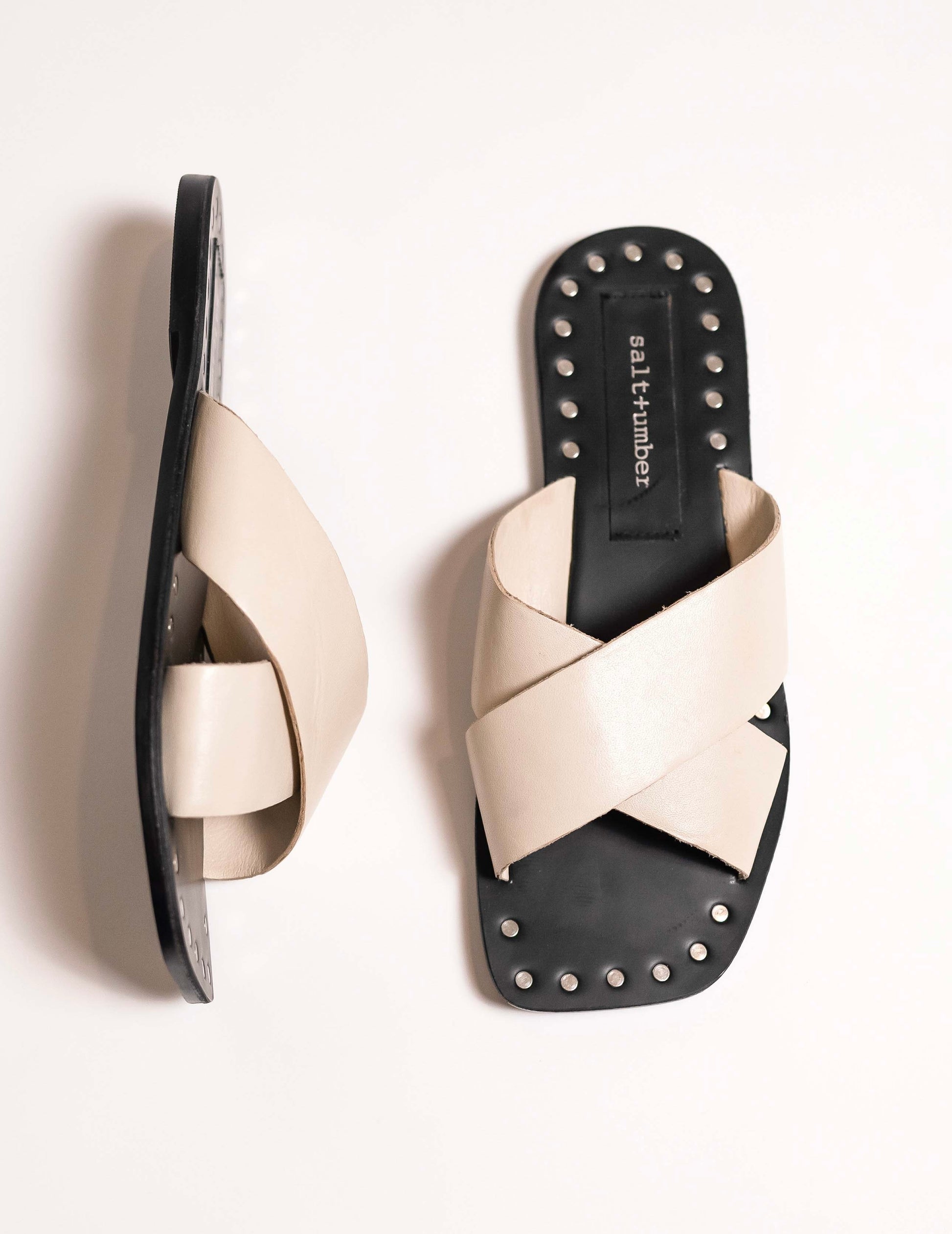 MAGIC is a standout style from our Reclaimed Collection, offering a nearly zero-waste option for your wardrobe. Featuring a gorgeous x-band silhouette with a squared-off toe and unique studded detailing, this sandal blends subtle elegance with modern flair. The soft bone leather contrasts beautifully with the black sole, making it a versatile piece for any occasion.