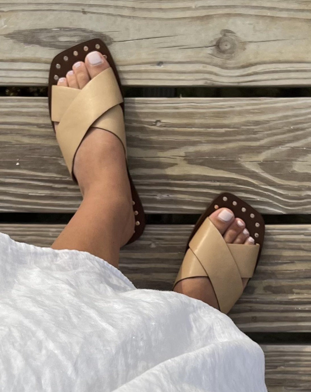 Part of our Reclaimed Collection, MAGIC is as close to zero waste as you can get. This stunning x-band silhouette features a squared-off toe and a unique studded design at the toe for an eye-catching yet subtle touch. The soft tan leather will only get better with age, and the entire sandal is crafted from 100% upcycled leather and outsoles.