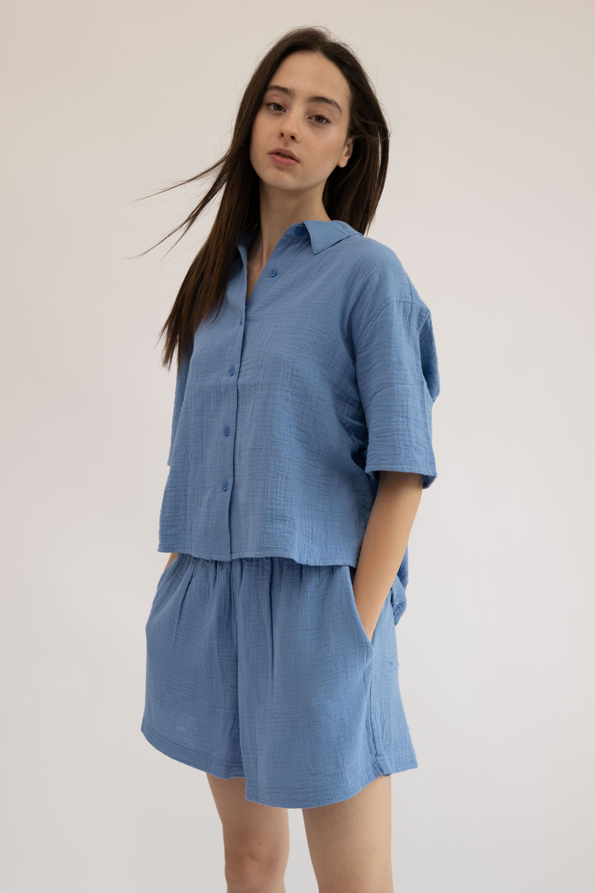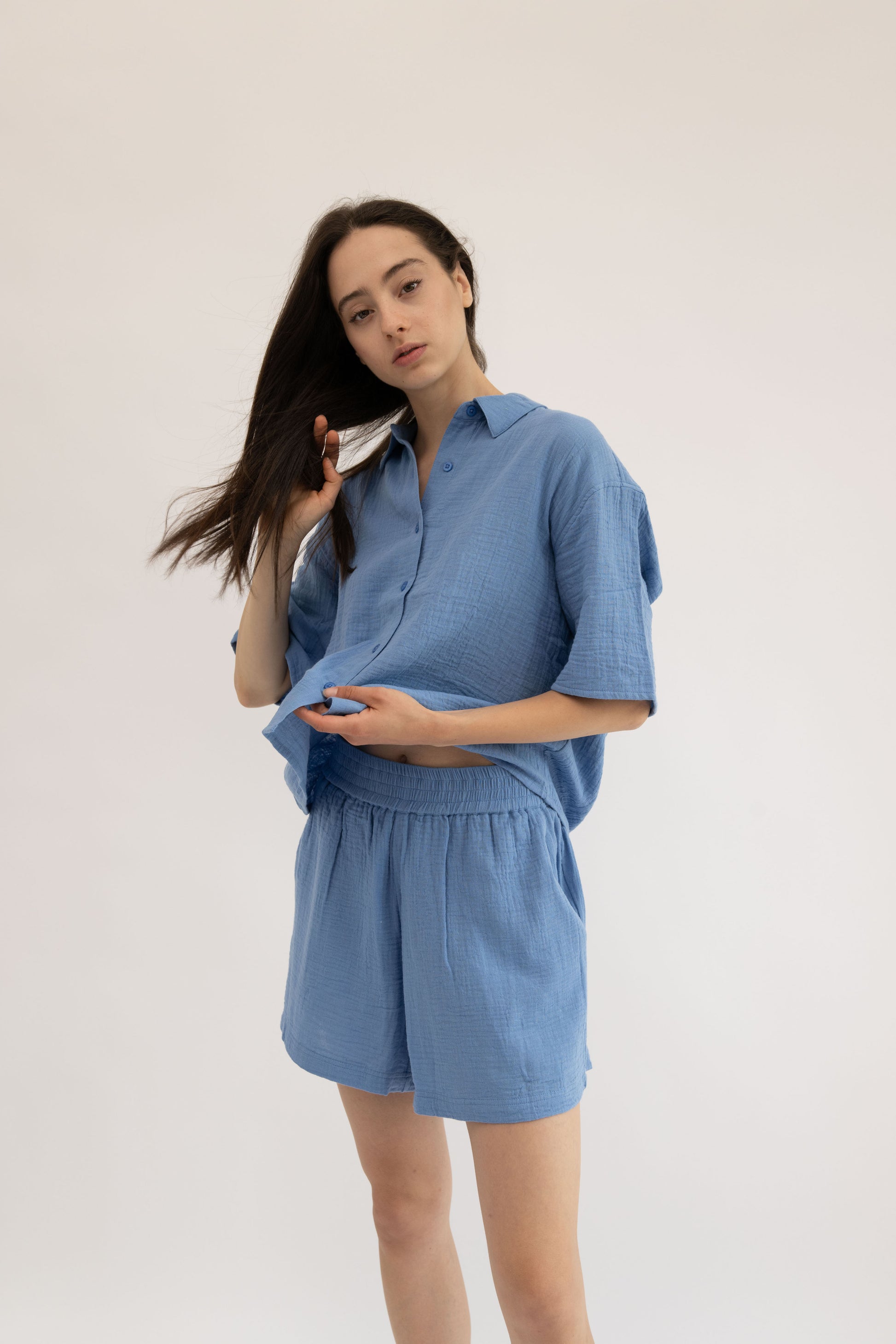 Made from 100% BCI-certified cotton gauze, these shorts are soft, breathable, and designed for ultimate comfort. Featuring an elasticized waist for a perfect fit, they’re ideal for everyday wear, lounging, and layering. For a coordinated look, pair them with our matching pants or tops to create the perfect twin set.